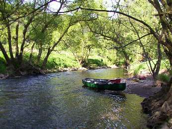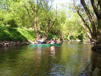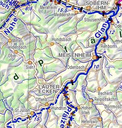 Der Glan Der Glan ist in seinem gesamten Verlauf ein eher ruhig dahin fließender Wiesen- und Kanu-Wanderfluß, der aber trotzdem eine gute Strömung aufweist. Viele Kurven, kleine Schwälle und Stufen sorgen für Abwechslung, stellen jedoch keine besonderen Schwierigkeiten dar. Im Sommer ist auch Mal mit einer flachen Stelle zu rechnen, an der das Kanu ein paar Meter geschoben werden muß. Die dort vorhandenen Wehre lassen sich meist problemlos umtragen. Lediglich die Umtragung in Meisenheim ist etwas aufwändiger, hier ist es nötig, das Kanu 1x kurz über eine kleine Mauer zu heben. Danach durch die dort vorhandene Ausschilderung und unseren Kanuwagen auch gut zu meistern. Der Glan ist ein idealer Fluß für Anfänger oder den Naturgenießer unter den Paddlern. In der reizvollen Landschaft des Nord Pfälzer Berglandes gelegen, durchfließt er das äußerst reizvolle Glantal. Weite Strecken des Ufers sind von Bäumen bewachsen, man paddelt manchmal in einer fast urwaldartigen Landschaft. Man steigt in das Boot, lässt sich durch die weitläufige Wiesenlandschaft treiben, durchfährt einige interessante Schwälle, um sich dann wieder vom Zauber des schönen Tals einfangen zu lassen. In den malerischen Ortschaften, die man durchfährt, bekommt man Einblicke in idyllische Hinterhöfe und liebevoll angelegte Gärten. Wenn Sie schon einen guten Teil des weges zurückgelegt haben, erreichen Sie das Städtchen Meisenheim. Besuchen Sie auch die sehenswerte Stadt Meisenheim, die mit einer schönen Altstadt aufwarten kann. Verwinkelte Gassen, alte Fachwerkhäuser, oder ein Gang entlang der Stadtmauer laden zum Erkunden ein. Gute Restaurants, schöne Cafes und idyllische Picknickplätze direkt am Glan laden zum Verweilen ein. Hinter Meisenheim weitet sich das Tal und Weinberge säumen nun die Talränder bis zur Mündung des Glans in die Nahe. Bei gutem Wasserstand ist eine Weiterfahrt noch ca. 6 km bis nach Oberhausen möglich. |